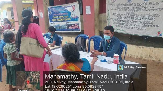 The Department of Community Medicine, SRM Medical College Hospital & Research Centre, in collaboration with SRM Institute of Science and Technology (SRMIST) and SDNB Vaishnav College for Women, organised a one-day medical camp at Nelvoy village on October 15, 2025.