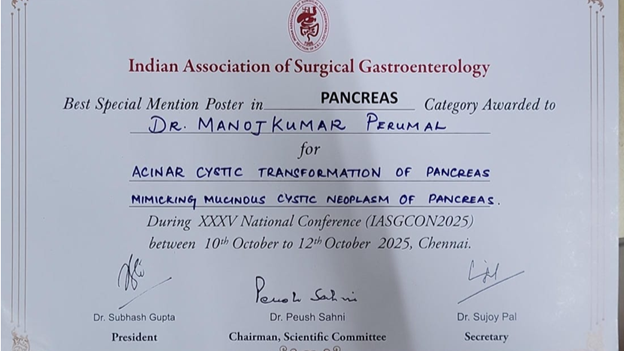 Competing among over 420 national submissions spanning E-posters, E-videos, and papers, Dr. Manoj Kumar’s work was honoured with the “Best Special Mention Poster in Pancreas” award.