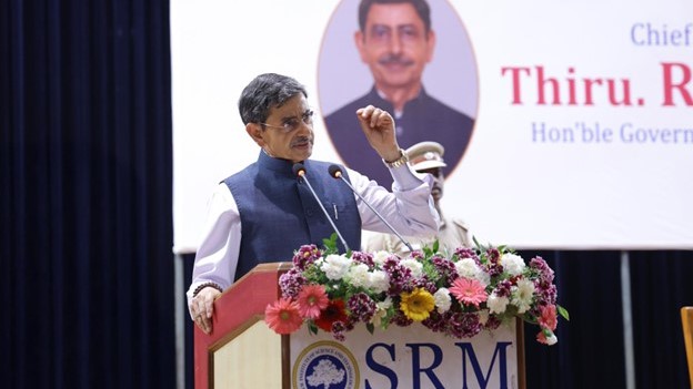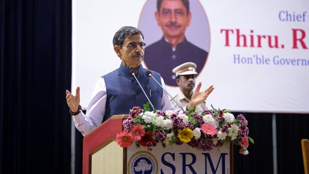 The event was presided over by Dr. T. R. Paarivendhar, Founder Chancellor, SRMIST, and was graced by Thiru R. N. Ravi, Hon’ble Governor of Tamil Nadu, as the Chief Guest. The proceedings commenced with the National Anthem, Tamil Thai Vazhthu, and the singing of Vande Mataram, marking 150 years of the national song that played a pivotal role in India’s freedom movement.